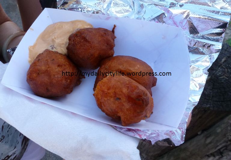 So we’re walking along, and we see this long line of people leading up to a tiny window in the wall of a building.  It’s like a fast food take-out type of place.  No tables, no seating area – just order at the window, take a number, and they pass your food to you through the window when it’s done.  My sister’s rule when traveling: eat at places with long lines, long lines mean the food’s good.  So we jumped in line, ordered conch fritters (picture below) and stood by the side of the road eating and watching the traffic go by – traffic that included cars, motorbikes, and horses!
